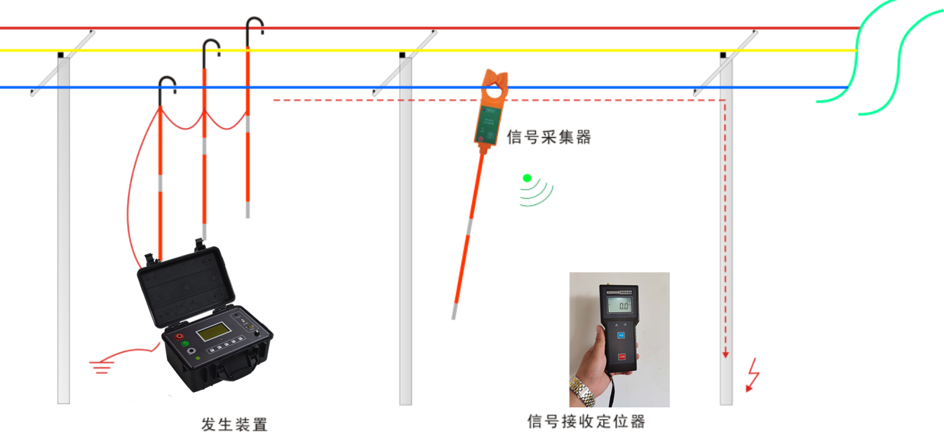 當線路出現接地故障時,在確定故障區段并且停運的情況下,利用信號源向故障線路注入特征電流,根據基爾霍夫定律,特征交流信號也一定通過故障點構成回路。